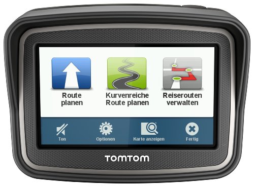 - Lieferumfang: TomTom Rider Europe; Motorradladestation und Kabel; Sichere RAM-Halterung; USB-Ladegerät für zu Hause; Softwarepaket zur Routenplanung auf dem Computer; Anleitung